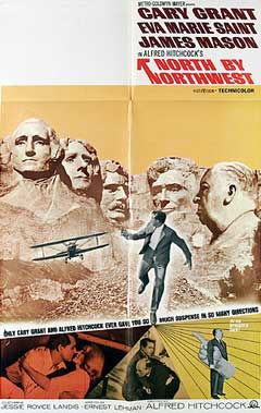 The cinematography work so well in this film and add to the story from grand hotels and estates to the United Nations, and from a train ride across the country to a corn field fleeing from a mysterious plane out to kill him to the climactic scene on Mount Rushmore. Hitchcock’s use of sound in this film (and all of his films), also adds to the thrilling suspense and action as depicted by the musical score or by the simple silence used as Thornhill stands on the side of the road as he waits for the mysterious Kaplan. The only sound comes from a few passing vehicles and another car on the other side of the highway. A man steps out and waits as the car speeds away. Thornhill crosses to him and strikes a conversation. He is not Kaplan, just a man waiting for the bus. He notices a plane in the distance dusting crops and states, before he boards the bus, “That plane’s dusting crops where there ain’t no crops.” Thornhill then notices the plane getting closer and closer and lower, thus leading to the iconic sequence as he runs and ducks from the plane.