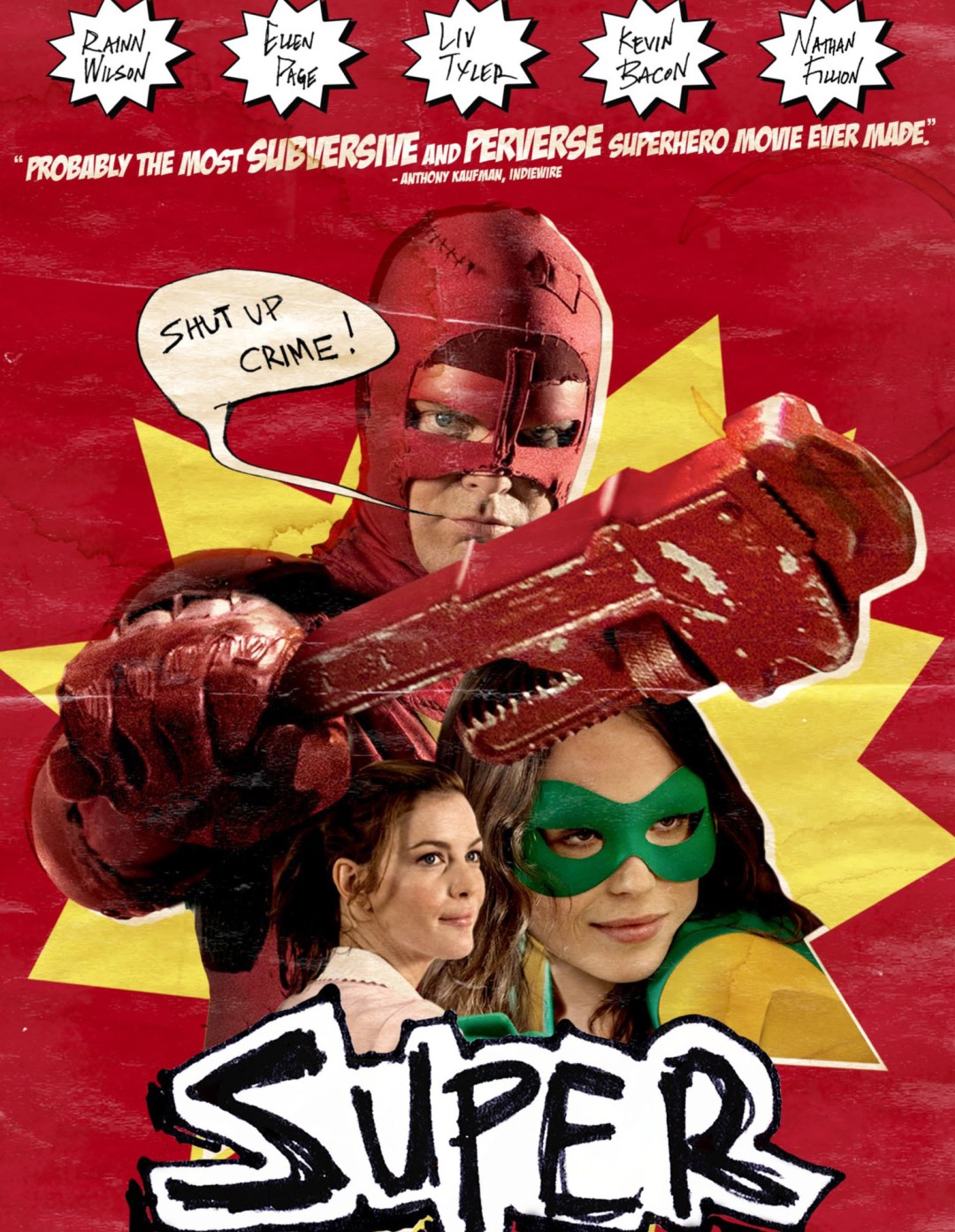 Super is a character driven film and seems to be driven by the lead character, a short-order cook, Frank (Rainn Wilson). Frank is an average guy and is married to, what he thinks is the woman of his dreams, Sarah (Liv Tyler). Sarah is a recovering addict and is then caught up in the hands of a slick drug dealer, Jacques (Kevin Bacon). When Sarah goes missing, Frank is determined Jacques had something to do with that and is determined to get her back. While watching a Christian cable channel, he gets a notion to emulate a superhero that stops evildoers with the power of God. Looking for more inspiration, Frank goes to a comic book store where he meets Libby (Ellen Page), a lively clerk who knows her comic superheroes. To get to Jacques, Frank dons the identity of a masked superhero, the Crimson Bolt, and takes the motto, “Shut up, crime!” Armed with a large wrench, he takes on evil wherever it may be by hiding behind dumpsters all day waiting for crime to happen.